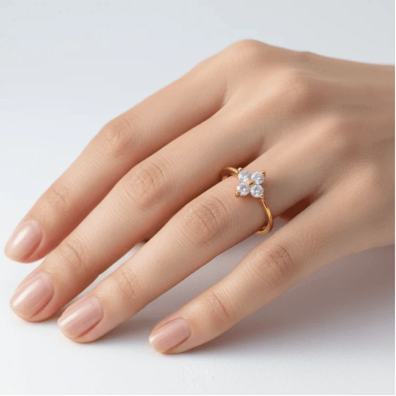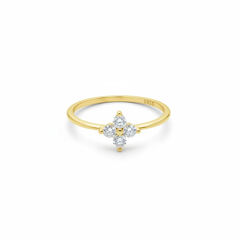 טבעת מכסף סטרלינג 925 בציפוי זהב 18K בשיבוץ 4 זירקונים היוצרים מראה מסוגנן ושל פרח יוקרתי