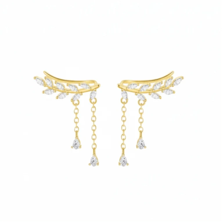 עגילים מהממים בצורת עלה לאורך האוזן עשויים מכסף סטרלינג 925 ובציפוי זהב 18 קראט.